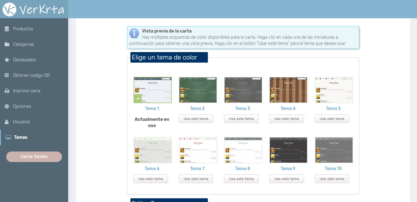 - Seleccionar entre distintos temas/colores de la carta.